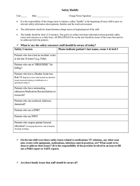 Safety Huddle Template. Web patient safety essentials toolkit: Web a daily safety briefing is one of the hallmarks of high reliability organizations (hros), which operate under continuously trying.